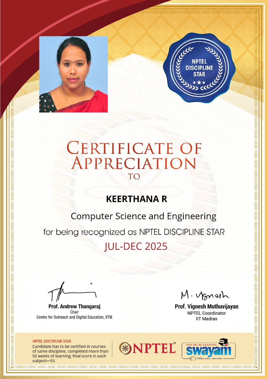 My journey at KSR College of Engineering, especially in the CSE Department, has been truly transformative. The department provided a supportive academic environment, experienced faculty, and ample opportunities to explore both technical and personal growth. The dedicated training programs, hands-on learning, and industry-oriented guidance helped me build strong fundamentals in computing and develop the confidence needed for my career. I am grateful for the encouragement, mentorship, and memorable experiences that shaped my professional identity. KSRCE will always remain a significant part of my growth and success.