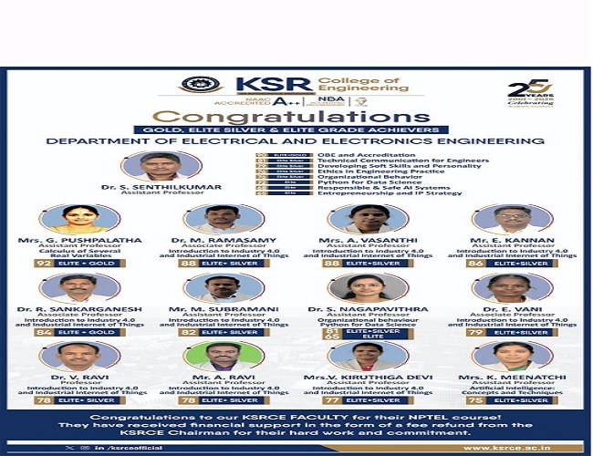 I am grateful to KSR College of Engineering for providing a robust foundation in Electrical and Electronics Engineering. The supportive faculty and comprehensive curriculum equipped me with the skills and confidence needed for my career as a Solution Architect, Virtusa Inc , Toronto, America Thank you, KSRCE, for shaping my professional journey.